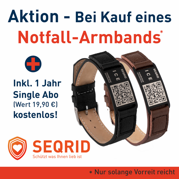 Das SEQRID Notfall Armband in Leder ist die elegante Sicherheitsergänzung für Ihren Alltag. Ob Büro oder Auto, Anzug oder Casual - die eleganten Lederarmbänder machen Ihre Notfalldaten für Helfer verfügbar - sekundenschnell - dort wo sie gebraucht werden
